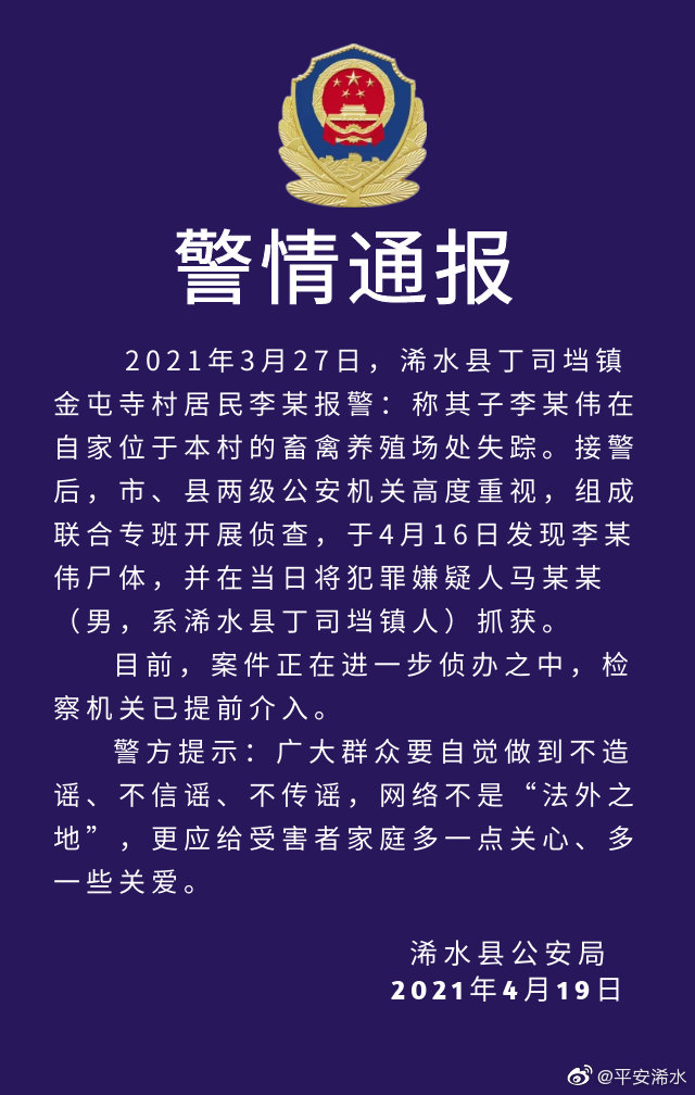 近日,@公安部儿童失踪信息紧急发布平台 发布湖北浠水一名4岁男童失踪消息,寻人启事发布后,引起网友关注。据@平安浠水 微博4月19日通报,2021年3月27日,湖北省浠水县丁司垱镇金屯寺村居民李某报警:称其子李某伟在自家位于本村的畜禽养殖场处失踪。接警后,市、县两级公安机关高度重视,组成联合专班开展侦查,于4月16日发现李某伟尸体,并在当日将犯罪嫌疑人马某某(男,系浠水县丁司垱镇人)抓获。目前,案件正在进一步侦办之中,检察机关已提前介入。