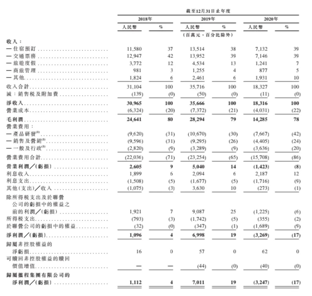 蒙上疫情阴影,携程在盈利层面也由盈转亏。招股书显示,2020年,携程全年营业亏损为14亿元,归属集团股东的净亏损为32亿元。相比而言,2019年其营业利润和净利润分别为50亿元和70亿元。
