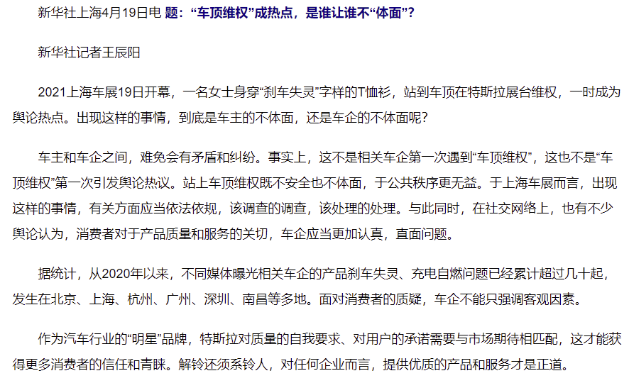 4月19日,新华社刊发评论文章指出,2021上海车展今日开幕,一名女士身穿“刹车失灵”字样的T恤衫,站到车顶在特斯拉展台维权,一时成为舆论热点。于上海车展而言,出现这样的事情,有关方面应当依法依规,该调查的调查,该处理的处理。作为汽车行业的“明星”品牌,特斯拉对质量的自我要求、对用户的承诺需要与市场期待相匹配,这才能获得更多消费者的信任和青睐。解铃还须系铃人,对任何企业而言,提供优质的产品和服务才是正道。