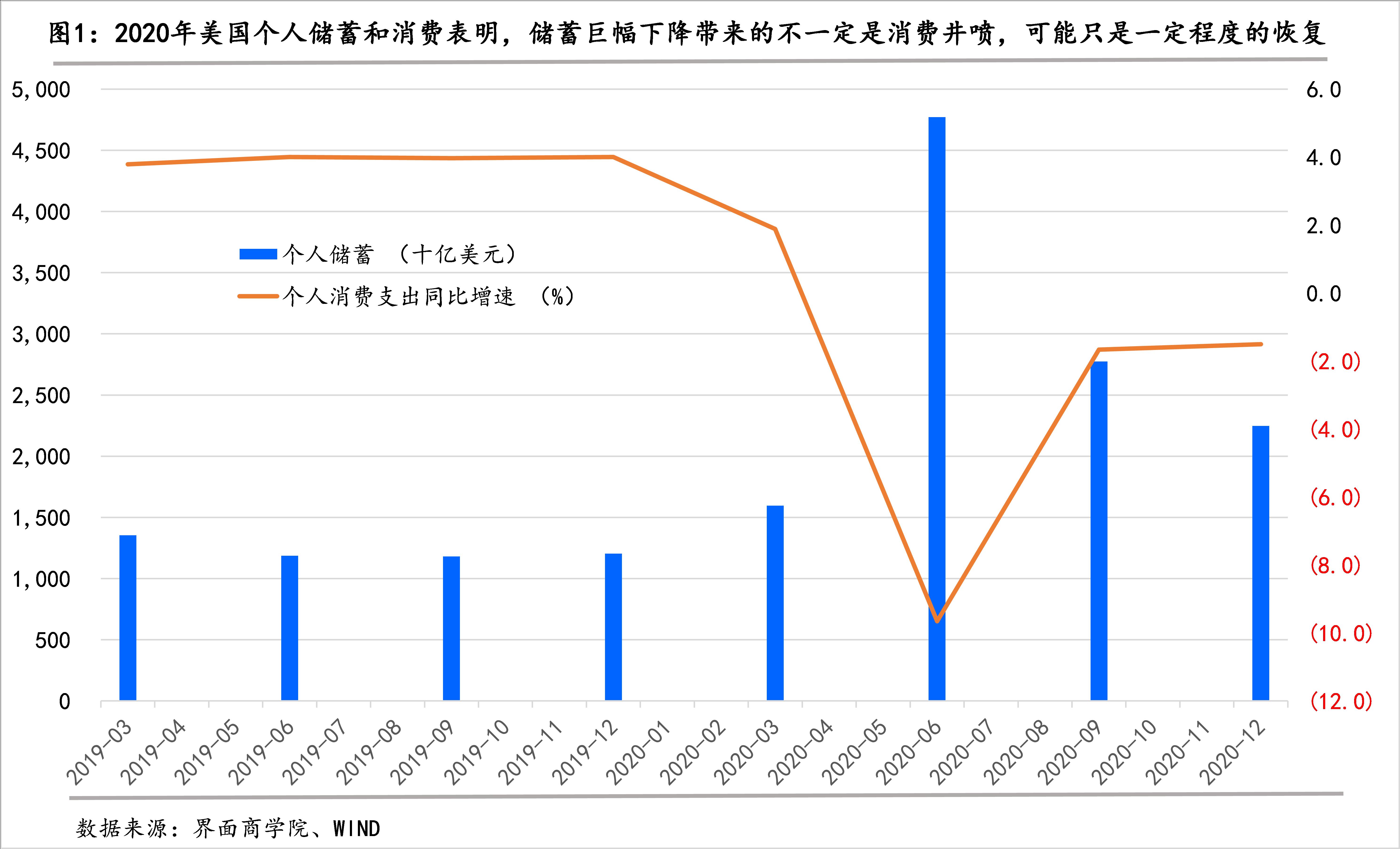 美国2020年二季度个人储蓄较一季度(1.5万亿美元)增加了3.1万亿美元,环比增长了两倍,此后又大幅减少,2020年四季度较二季度减少了2.5万亿美元。在三、四季度个人储蓄大规模快速减少时,虽然第三季度消费支出同比增速大幅回升,但第四季度陷入停滞,个人消费支出仍然同比负增长。