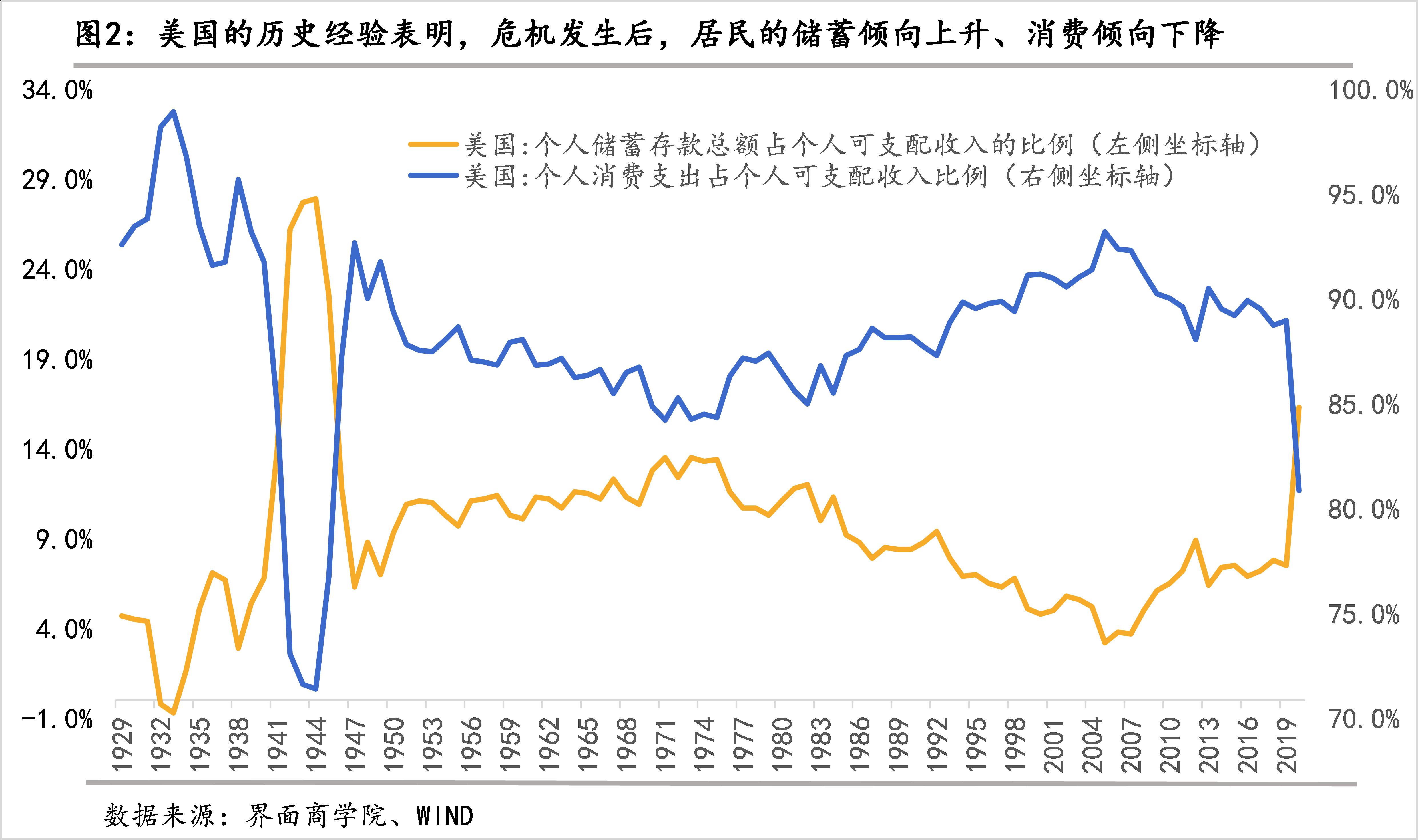 美国的历史数据已经多次证明了这一点。大萧条、珍珠港事件、冷战期间美苏关系开始对抗及阶段性缓和后再次对抗、1987年“股灾”、上个世纪末互联网泡沫破灭、次贷危机,均对美国的储蓄和消费倾向产生了明显影响,个人储蓄存款总额占个人可支配收入的比例在这些重要历史时点后均有抬升,只是持续时间和抬升幅度各有不等。