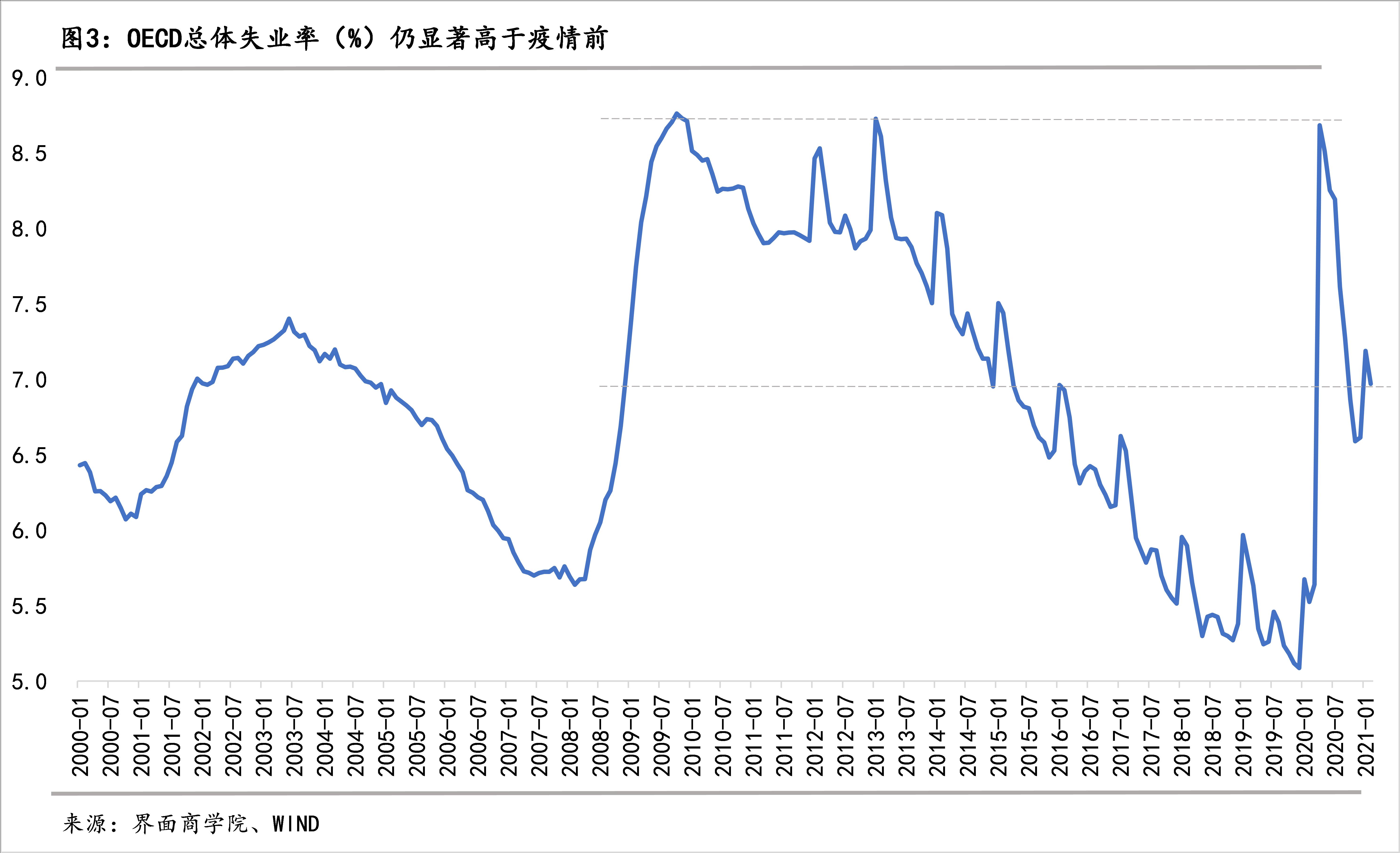 其次,对消费起决定作用的就业和收入,仍然面临较大的不确定性。疫情前,主要经济体失业率已经持续下降了10年,受疫情冲击在2019年12月触底后骤然上升,OECD总体失业率在2020年4月份升至8.7%,与金融危机时的最高点相差无几,此后虽然下降,但仍然伴随疫情有所反复,截至2月份,失业率仍显著高于疫情前,与2014年-2015年的水平相当。