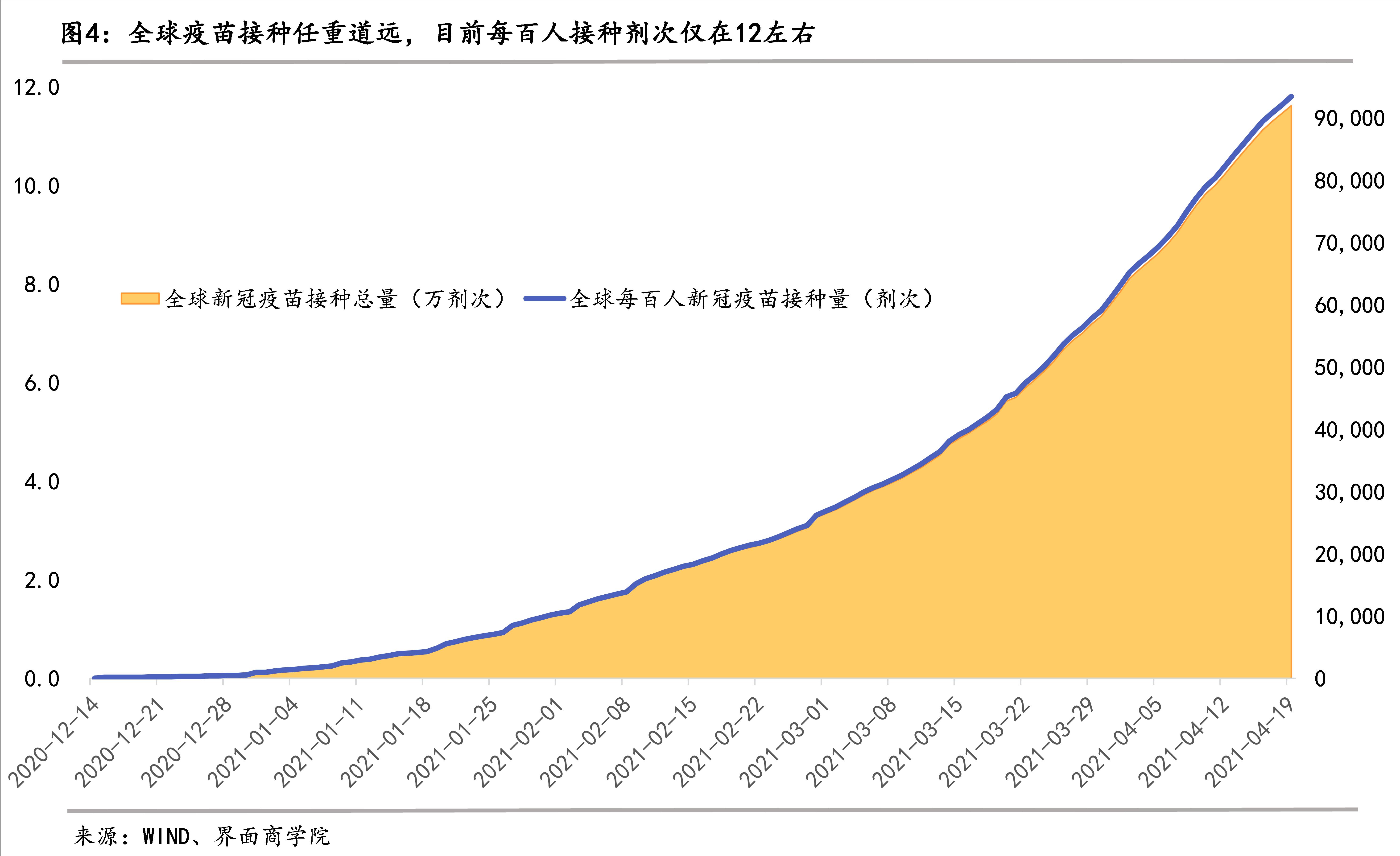 截至4月19日,全球每百人接种的新冠疫苗仅为11.8剂次。各国接种情况差异显著,其中,接种最快的是以色列和阿联酋,每百人接种的剂次分别119.47、97.82;智利、英国、美国等七个国家在第二梯队,接种剂次在60-70之间;马尔代夫、塞尔维亚等五个国家接种剂次在30-60之间;立陶宛、德国、法国等26个国家接种剂次在20-30之间。
