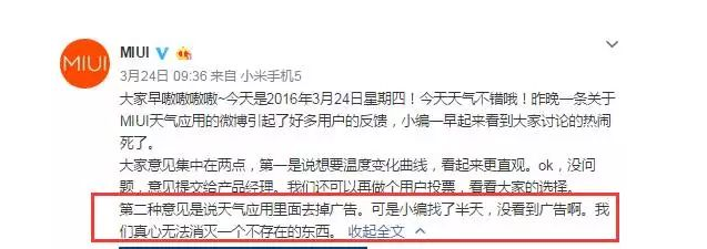 以上述MIUI的广告问题为例,有用户将其反馈给MIUI官方微博。然而官方微博的回应先是谈其“天气中咨询内容是可以设置关闭的”而后又谈“可是小编找了半天,并没有找到广告啊,我们真心无法消灭一个不存在的东西”。因其敷衍、傲慢的回应态度惹得众多小米粉丝愤怒不已。
