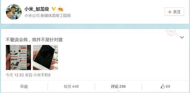 日前,微博认证为“小米公司新媒体高级工程师“的小米员工邹龙俊在微博上发布了一张小米手机的手机套图片,讽刺其它友商的产品都是垃圾,让当前几乎所有的手机品牌中枪。而在事后更是调侃只是玩玩而已,但经过广大网友的一番洗礼,意识到事态扩大之后,又慌忙的删除微博。