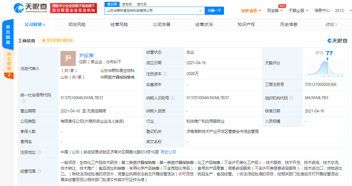 据天眼查APP显示,4月16日,山东华熙科茵生物科技有限公司成立,注册资本2000万人民币,法定代表人为尹延箫,经营范围包括生物化工产品技术研发;第一/二类医疗器械销售;化工产品销售;食品添加剂销售;专用化学产品销售;食用农产品零售等。股东信息显示,该公司由华熙生物科技股份有限公司全资持股。