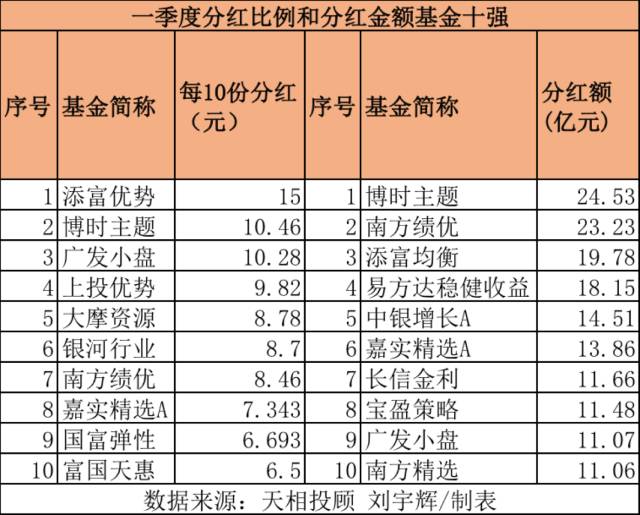 而从分红比例看,则以汇添富优势精选最为慷慨,该基金于3月4日每10份分红高达15元,在一季度分红比例最高。博时主题和广发小盘也推出“10派10”这样的大手笔分红,两只基金每10份分别分红10.46元和10.28元,上投中国优势、大摩资源优选、银河行业、南方绩优、嘉实研究精选、国富弹性、富国天惠等多只基金分红比例也很大,每10份分红在6.5元到10元之间。
