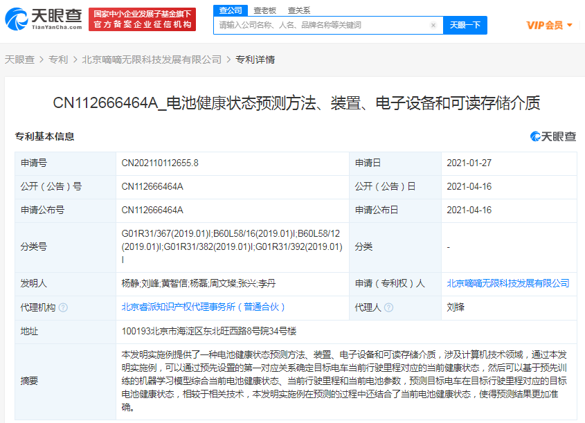 据天眼查APP显示,4月16日,北京嘀嘀无限科技发展有限公司公开一项名为“电池健康状态预测方法、装置、电子设备和可读存储介质”的专利,公开号为CN112666464A,申请日期为2021年1月。