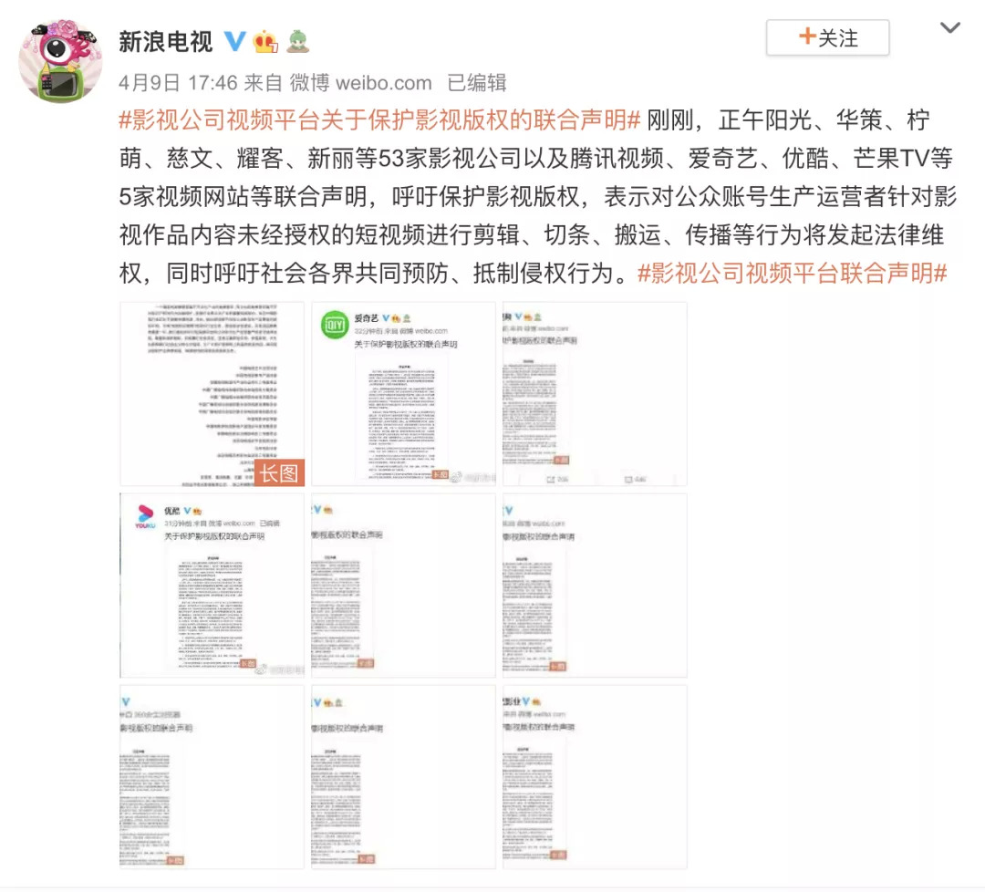 4月26日是世界产权日,每年此时,知识产权界总会有些维权行为,今年的第一枪,来自中国电视艺术交流协会等协会、爱奇艺、优酷、腾讯视频等平台以及正午阳光、华策影视等影视公司,共同呼吁短视频平台和公众账号生产者不得对相关影视作品实施剪辑、切条、搬运、传播等侵权行为。