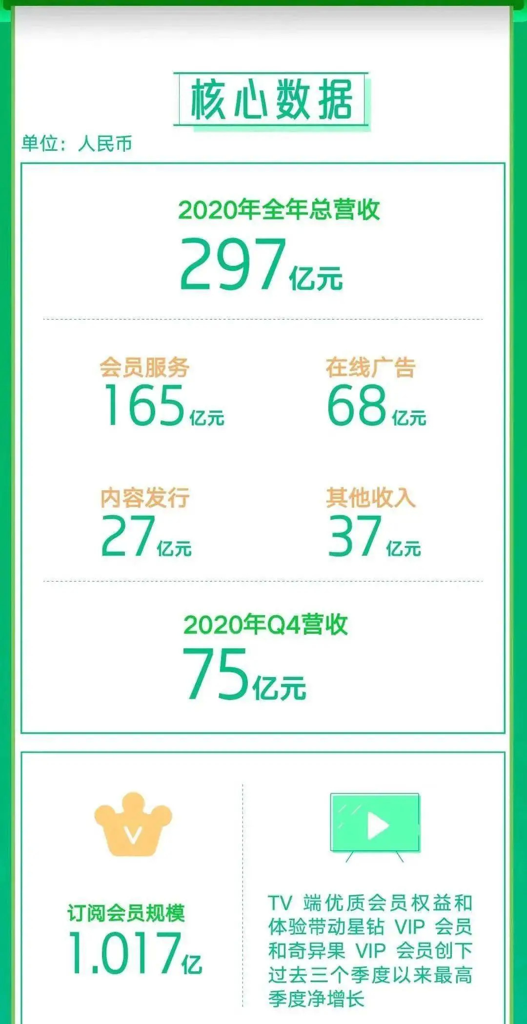 腾讯视频情况也只是略好,2019年底付费人数破亿,2020年Q4季度财报显示,付费会员数达到1.23亿。