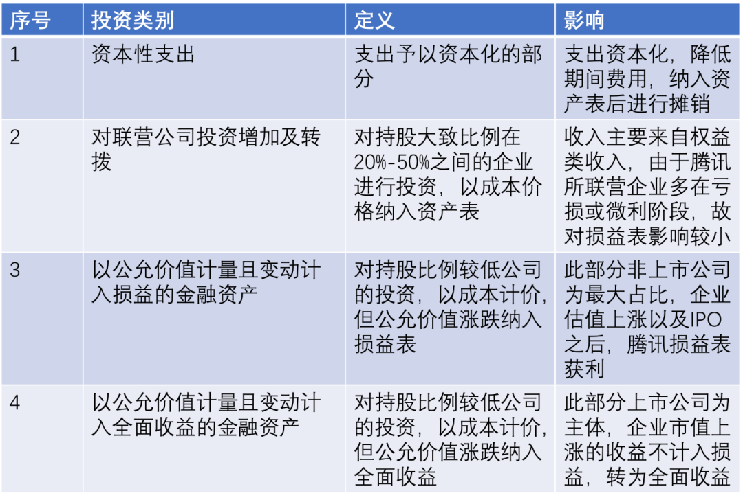 分析至此,我们更倾向于将腾讯投资拆成几个部分:主体的资本性支出,战略投资的对联营企业投资,倾向于投行化的投资行为。