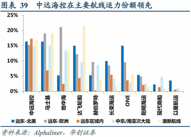 很显然,规模很重要,这也是中远海控要打造的运力航线网络的目标。在2018年完成东方海外的收购后,中远海运集运成为全球第三大班轮公司。而且“不偏科”。华创证券研报显示,中远海控在远东-北美、远东-欧洲、远东区域内、中东/南亚次大陆、澳新航线的运力份额均处于行业前三的地位。