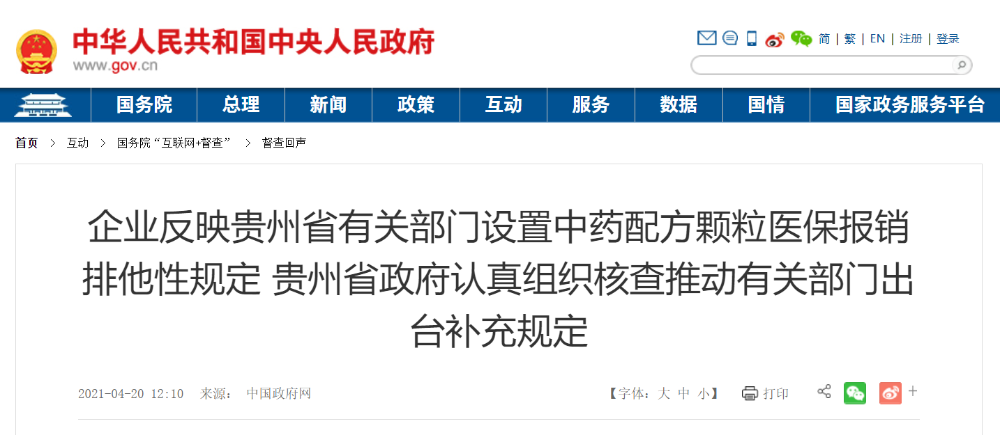 据中国政府网消息,四川省刘先生2020年12月3日通过国务院“互联网+督查”平台反映,贵州省设置中药配方颗粒医保报销排他性规定。