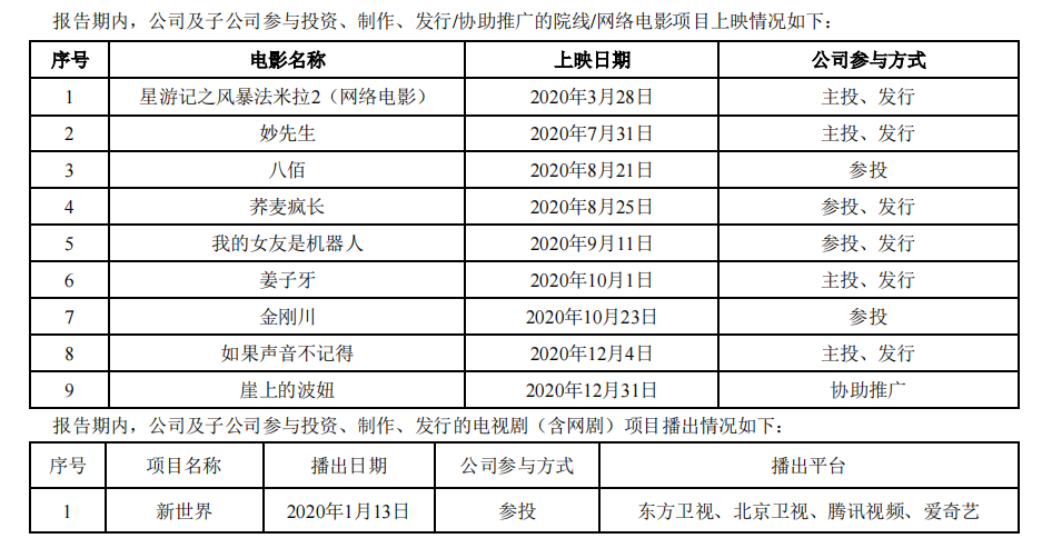 举例来说,2020年年报中光线确认了《新世界》的电视剧投资收入,《新世界》已于2020年1月13日在东方卫视、北京卫视、腾讯视频、爱奇艺播出。《新世界》项目位列光线前收入贡献五大影视项目中的第二位,仅次于《姜子牙》。