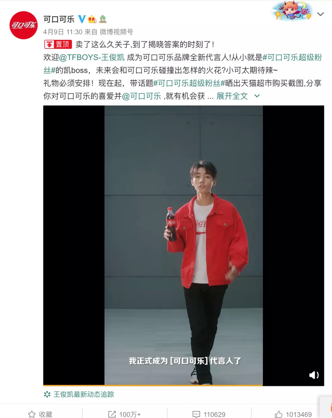 4月9日可口可乐官宣代言人王俊凯,与百事可乐不一样的是,可口可乐官宣王俊凯为品牌全新代言人。