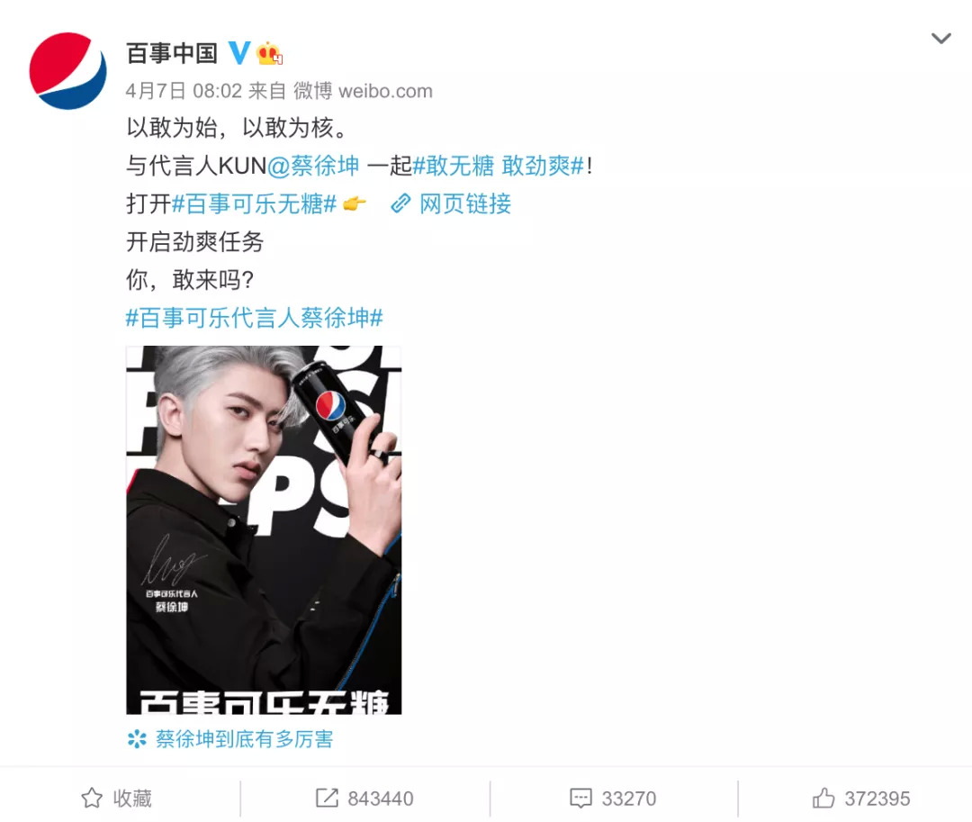 4月7日百事可乐官宣代言人蔡徐坤。