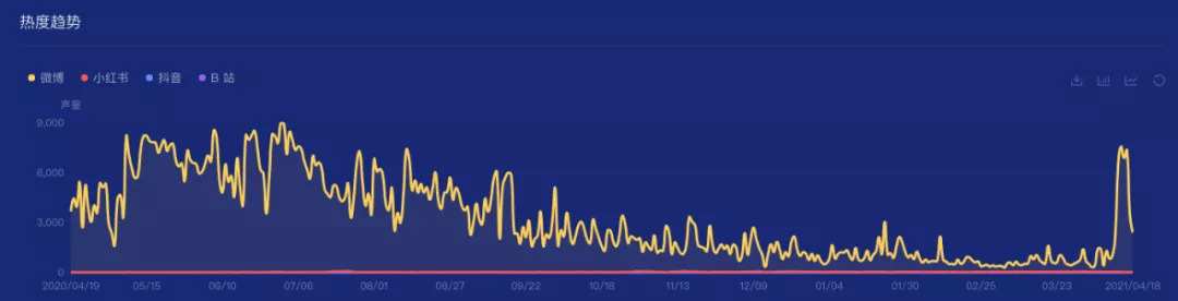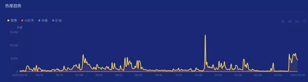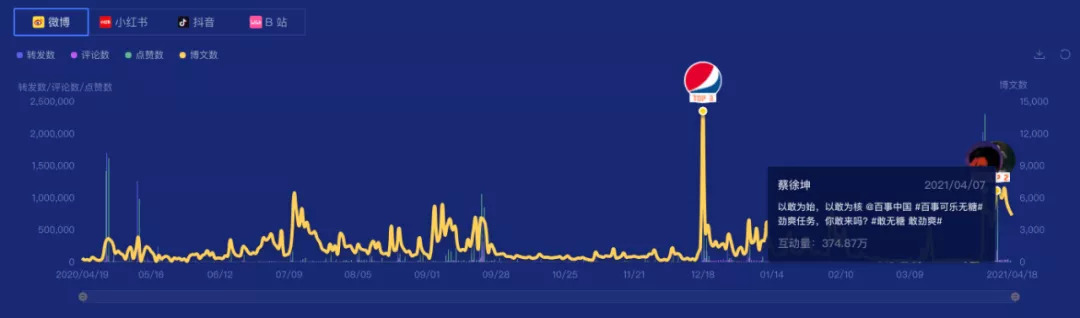 根据时趣洞察引擎,2020.04.19-2021.04.18区间监测,“百事可乐”的社交声量趋势局部攀升、局部平稳,在去年12月18日有一个陡增,主要是品牌年末营销战役。