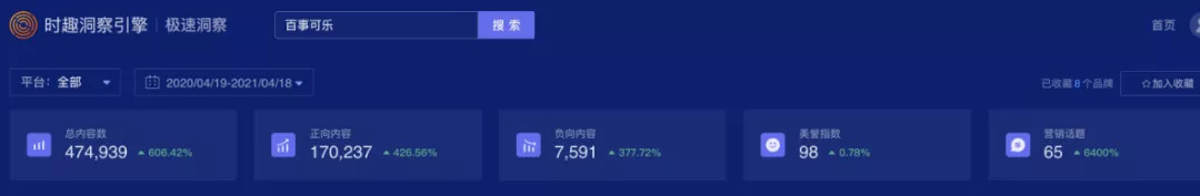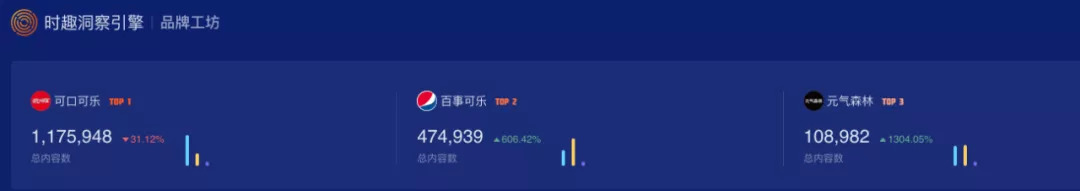 根据时趣洞察引擎数据显示,2020.0419-2021.0418期间,可口可乐总营销内容数为1175948,百事可乐内容数为474939,元气森林的营销内容总数为108982,虽然元气森林内容数远低于可口可乐和百事可乐,但是其增速大大高于可口可乐、百事可乐。