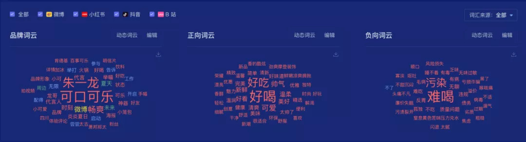 根据时趣洞察引擎数据显示,从提及“百事可乐”的内容高频词可以看出,“李现、杨洋、邓伦、杨紫”等关键词是关注重点,这个和百事明星营销策略息息相关。从提及“可口可乐”的内容高频词可以看出,“朱一龙、龙哥、代言人、小笼包”等关键词提及更多,这个和去年品牌系列代言人营销有很大关系,截止目前,去年明星营销依旧位居品牌社交热度榜。