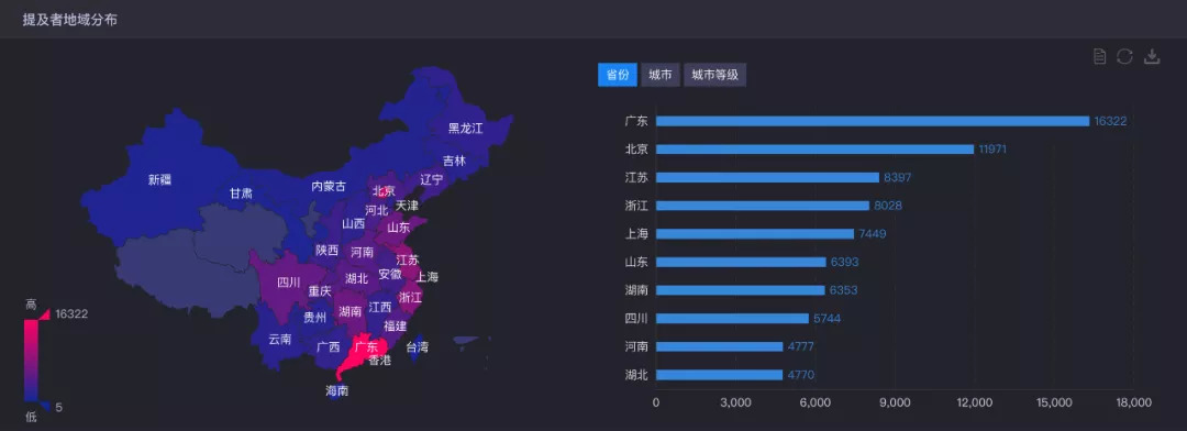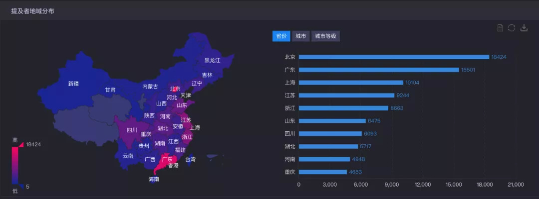 根据提及者地域分布图,可以明显看出,关于“百事可乐”的提及者主要以广东、北京和江苏为主,“可口可乐”的提及者主要以北京、广东和上海为主。