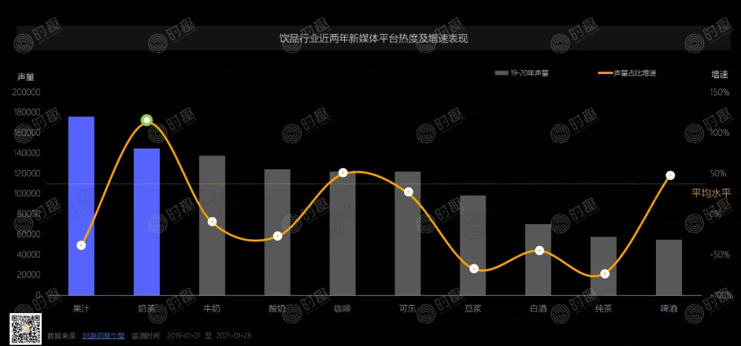 一方面是消费者不断升级的诉求,另一方面品牌营销力度也不断在加大,结合声量占比增速来看,奶茶和咖啡、啤酒的声量增速远高于行业平均水平,可乐目前略低于行业水平。