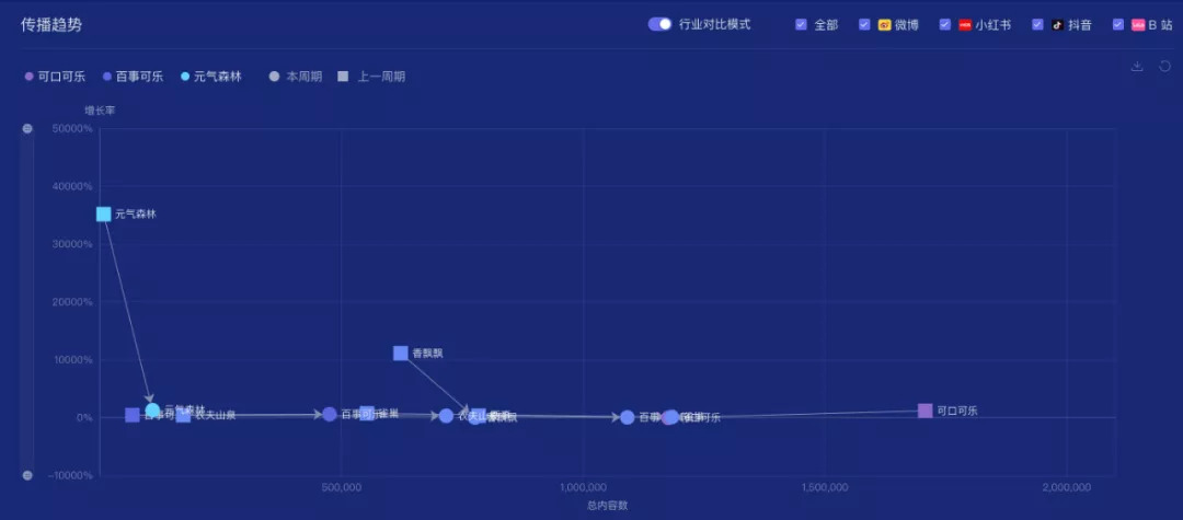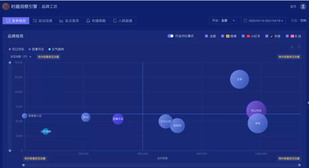 根据时趣洞察引擎数据显示,2020.0419-2021.0418期间,百事可乐位于第一象限,其营销战役具备高内容量高互动量特点,可口可乐第一象限和第四象限之间,互动量低于百事可乐,元气森林位于第三象限,处于一个新生命的初期阶段,其营销增长率高于其他品牌。