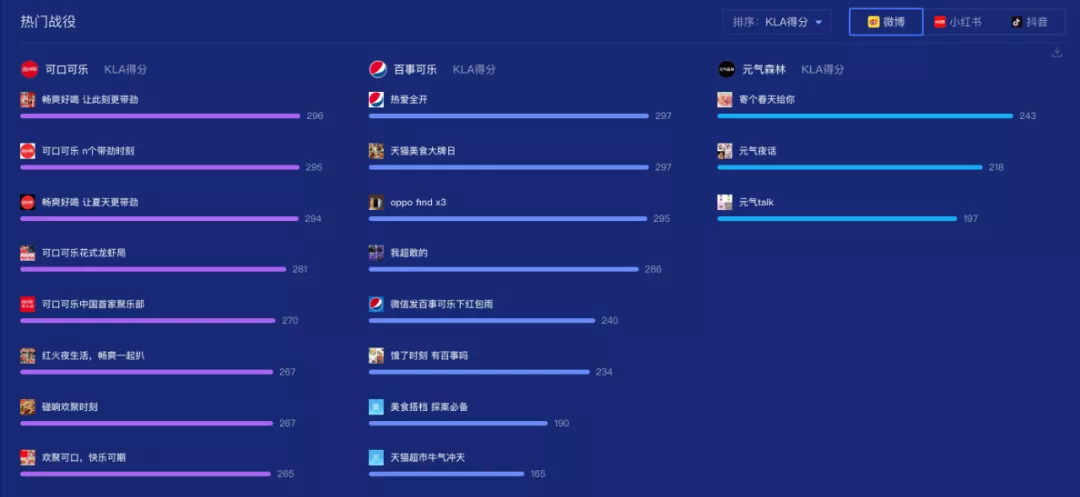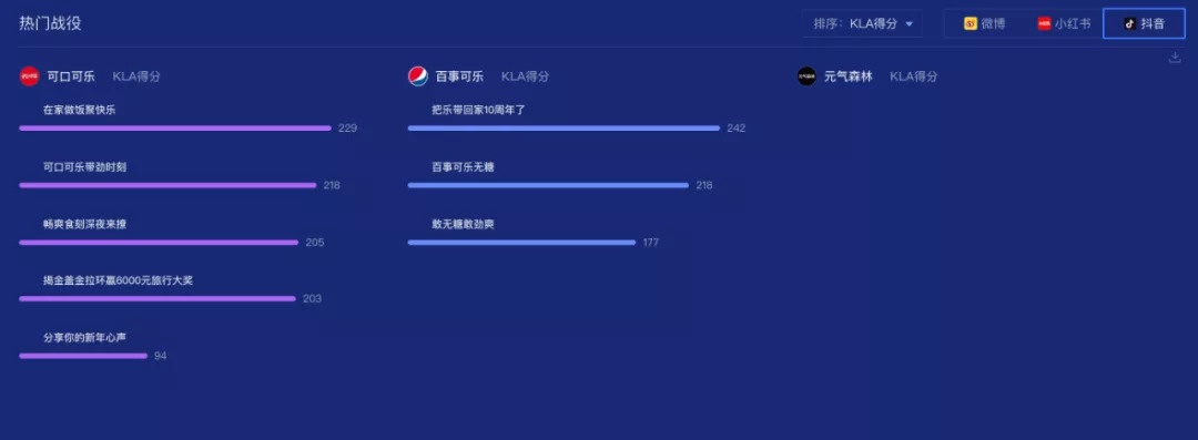在抖音热门战役中,可口可乐占有五席,其KLA得分差距明显,百事可乐占有3席,其KLA得分较可口可乐相比更加稳定,元气森林在抖音平台热门战役较少。从目前来看,品牌在短视频平台的营销动作都处于一个比较初期的阶段,还没有像微博平台那么成熟,后期品牌的营销策略和资源或许会向抖音这样的平台倾斜。