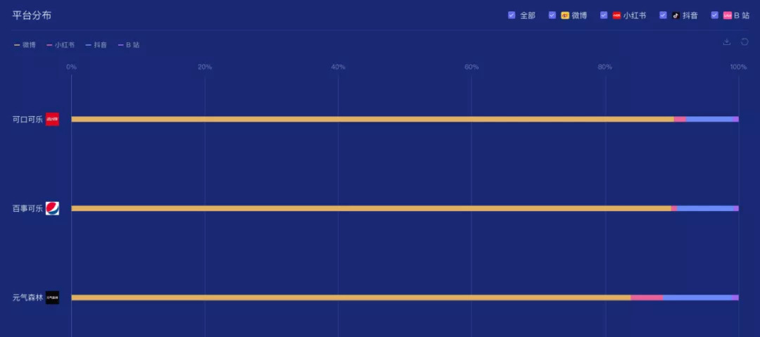 结合时趣洞察引擎数据显示,百事可乐和可口可乐的营销战场投入比重几乎一致,将近90%在微博平台,6%-7%在抖音,2%在小红书,仅有1%左右在B站。相比之下,元气森林不到85%在微博,抖音占比将近10%,小红书5%左右,剩下1%左右在B站。