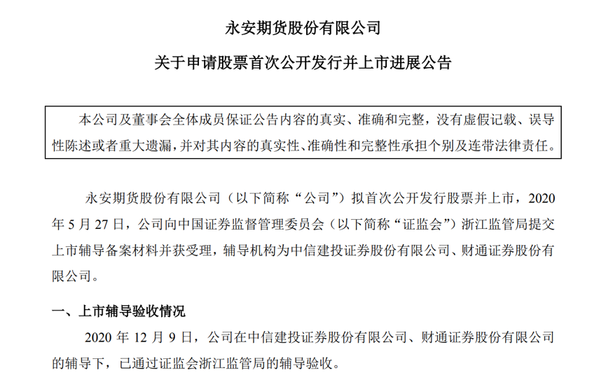 2020年,期货公司掀起一轮上市潮,而永安期货IPO之路亦始于2020年。2020年5月27日,新三板市场挂牌的永安期货正式向浙江证监局提交上市辅导备案材料并获受理。同年12月,公司通过浙江局辅导验收,并同步报送了上交所主板上市的申报材料。