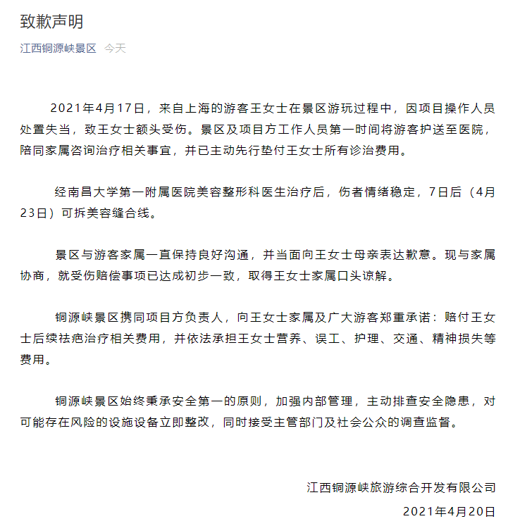 4月20日,江西铜源峡景区微信公众号发布致歉声明,就女游客受伤事件公开道歉。4月17日,来自上海的游客王女士在景区游玩过程中,因项目操作人员处置失当,致王女士额头受伤。景区及项目方工作人员第一时间将游客护送至医院,陪同家属咨询治疗相关事宜,并已主动先行垫付王女士所有诊治费用。现与家属协商,就受伤赔偿事项已达成初步一致,取得王女士家属口头谅解。铜源峡景区承诺,赔付王女士后续祛疤治疗相关费用,并依法承担王女士营养、误工、护理、交通、精神损失等费用。