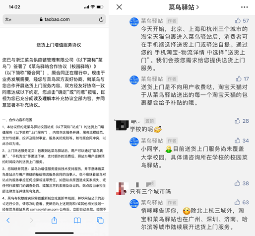 (校园驿站的送货上门服务、菜鸟北上杭推出按需送货上门服务)