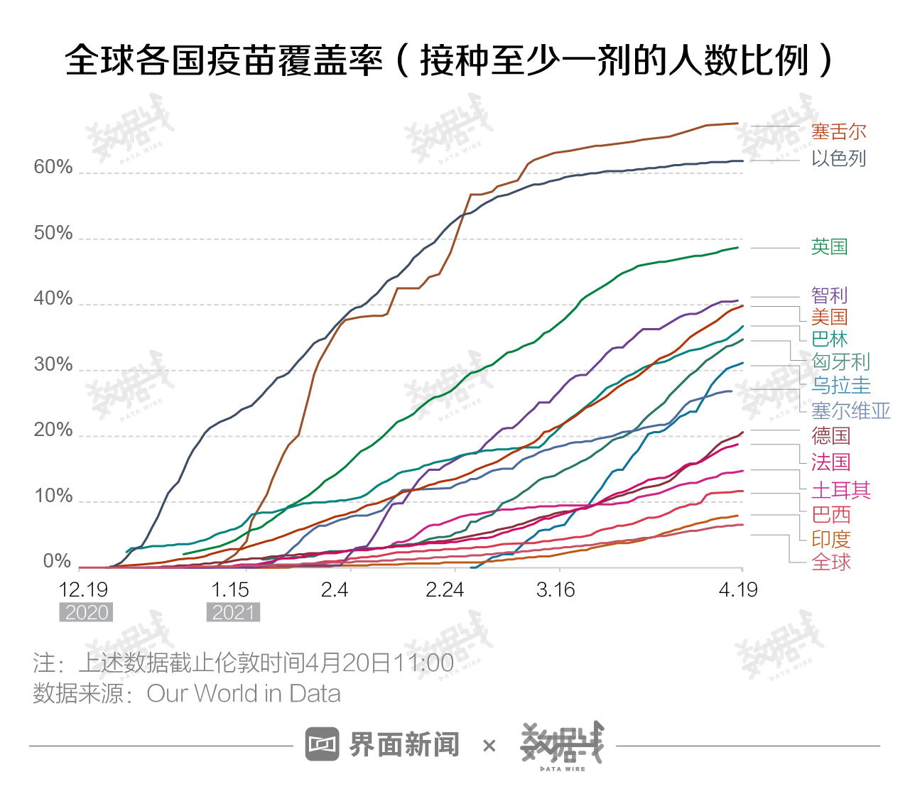 从各国疫苗覆盖率(即已接种至少1剂的人数占人口比例)来看,2月下旬,塞舌尔超过以色列成为世界第一,目前两国疫苗覆盖率均已超六成,接近群体免疫目标。疫苗覆盖率第三为英国,已接种近五成。美国疫苗覆盖率排名第五,在30%至40%之间。印度疫苗覆盖率相对较低,不足10%。