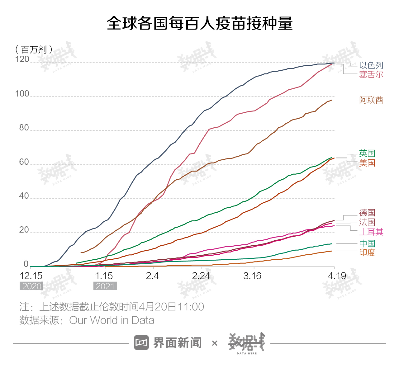 中国人口基数大,所以每百人接种量较低。4月初,每百人接种量超10剂,目前为13.55剂。