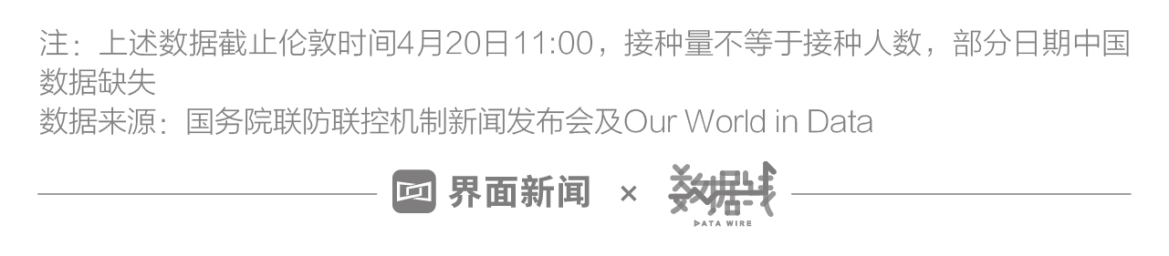 从中国接种量来看,中美之间的接种总量差距在3月初最大,美国为中国近两倍。3月中旬起,中国接种速度加快,两国之间差距逐渐缩小,目前仅差距1600万剂。4月12日,中国接种总量已超2亿剂。