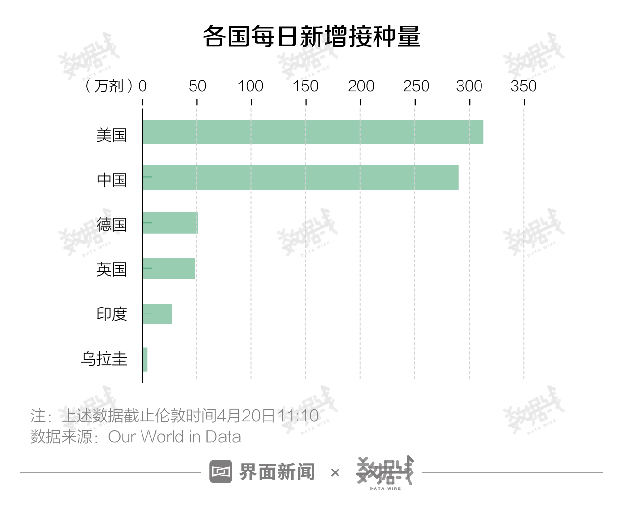 从每日新增接种量来看,中国仅次于美国,平均每天接种近300万剂。德国排名第三,每日新增接种量不到中国的两成。