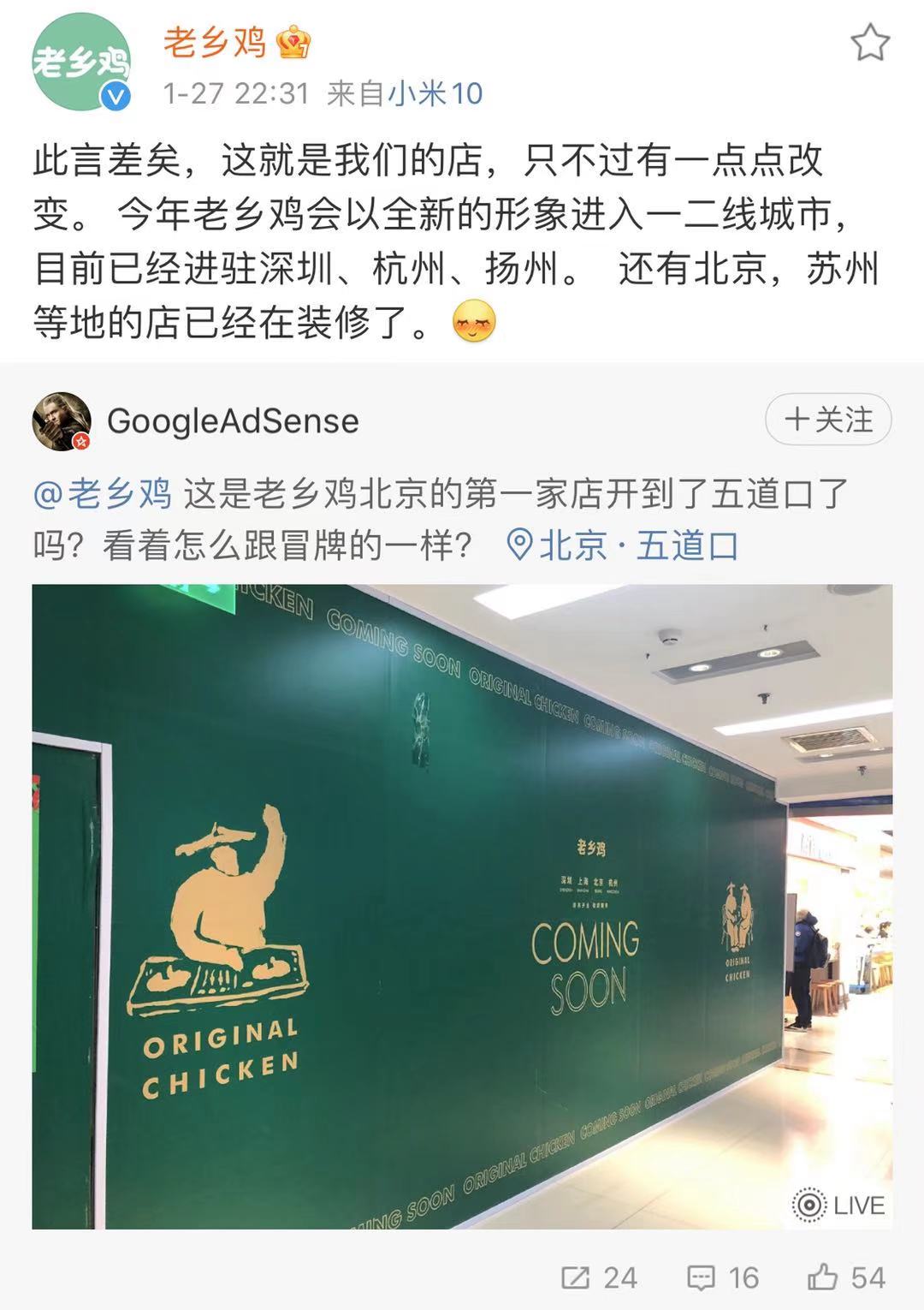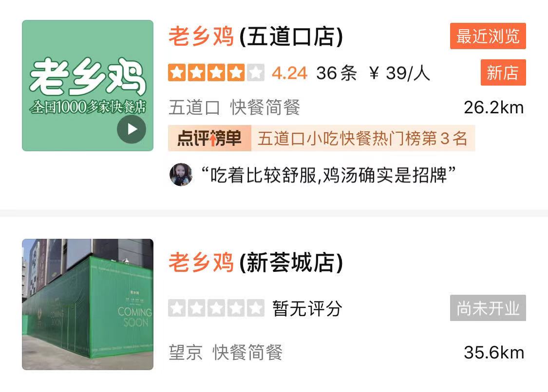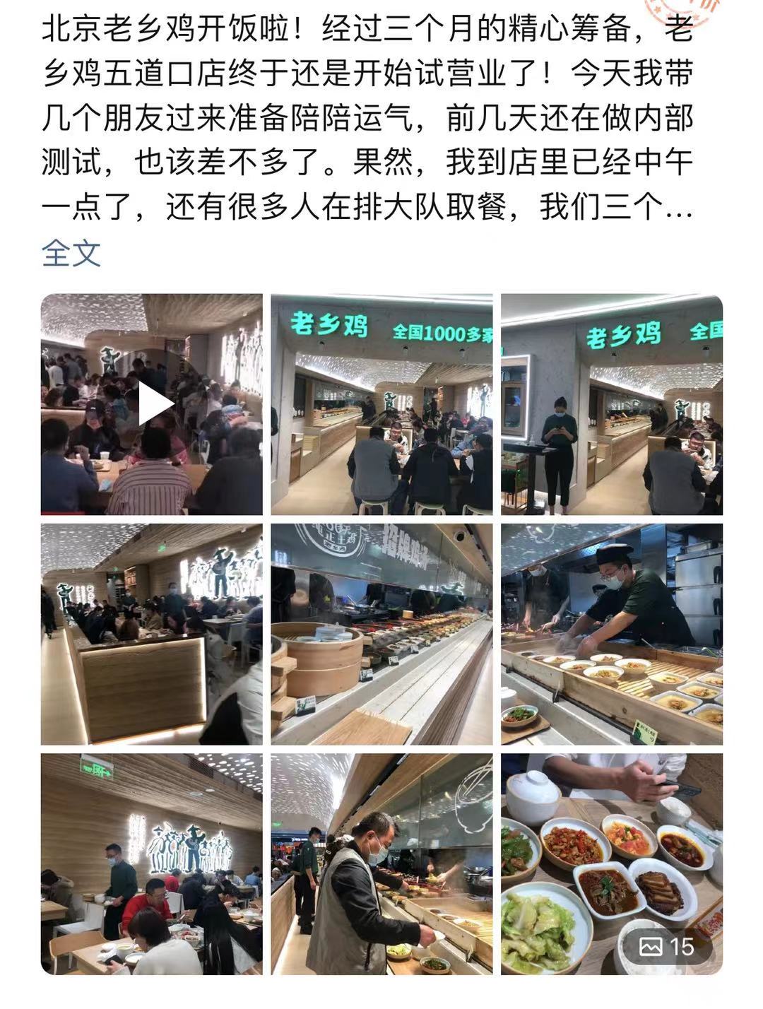 界面新闻注意到,位于北京五道口购物中心内的老乡鸡门店已开始营业。今年1月份,老乡鸡的官方微博曾转发过一条网友拍摄的五道口门店装修围挡图,表示今年老乡鸡会以全新形象进入一二线城市,包括深圳、扬州、北京和苏州。
