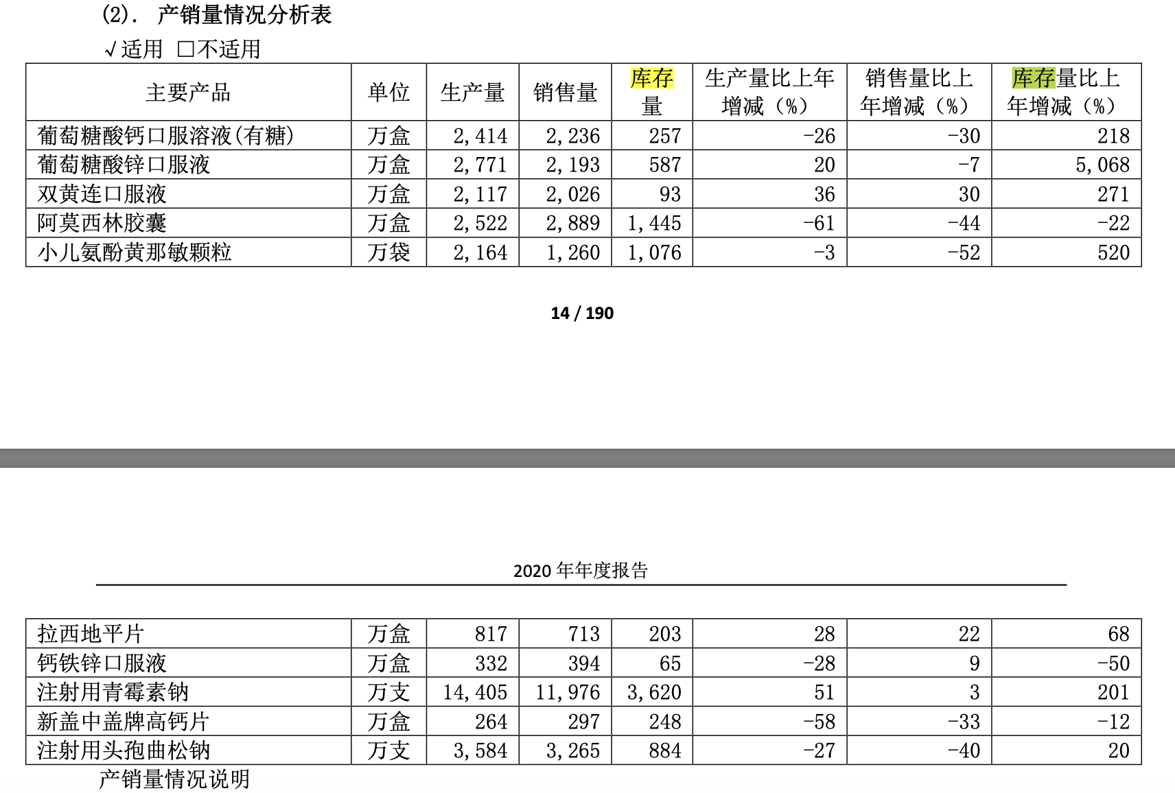 年报显示,2020年哈药股份葡萄糖酸钙口服溶液(有糖)、葡萄糖酸锌口服液、双黄连口服液、小儿氨酚黄那敏颗粒库存量同比增长218%、5068%、271%和520%,其中小儿氨酚黄那敏颗粒的库存量几近和2020年销售量持平。