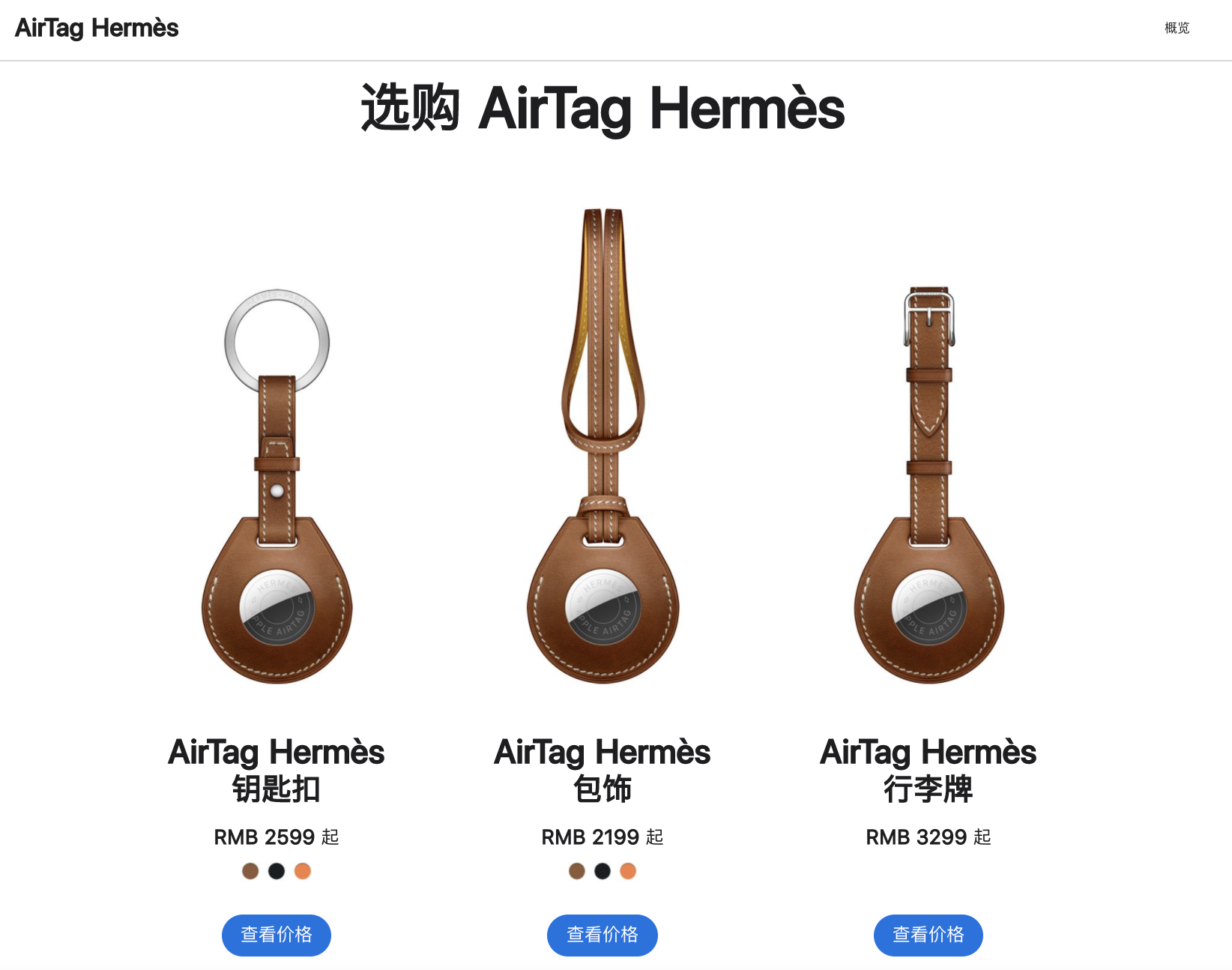 官网显示,AirTag Hermès有钥匙扣、包饰、行李牌三种样式可供选择,基础售价分别为2599元、2199元及3299元。其中,钥匙扣和包饰还有橙色、靛蓝、棕色三种配色可供选择。