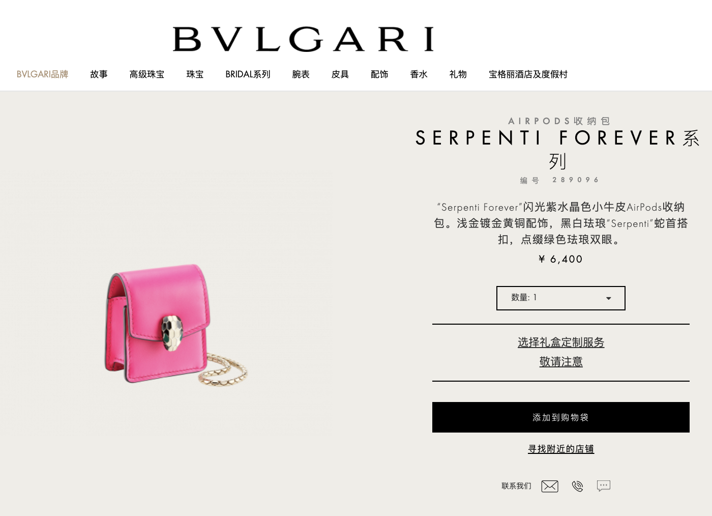 比如,LOEWE罗意威以其热门的动物系列包袋原型,推出了大象系列的iPhone手机壳;随着AirPods上市刮起一阵无线耳机的新热潮,Bvlgari宝格丽顺势推出了以其经典蛇首包袋为灵感的AirPods保护壳。