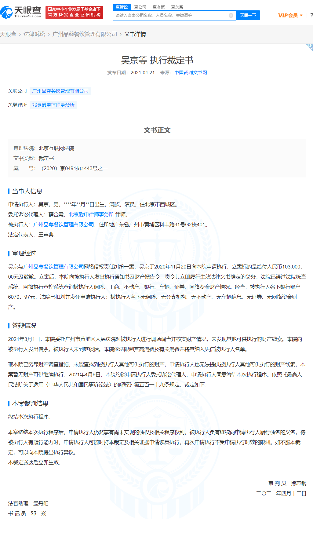 该裁定书显示,吴京与广州品尊餐饮管理有限公司网络侵权责任纠纷一案,吴京于2020年11月20日向本院申请执行,立案标的是给付人民币103000元及致歉。经查,被执行人名下银行账户约6071元,法院已扣划并发还申请执行人;被执行人名下无保险、无分支机构、无不动产、无车辆信息、无证券、无网络资金财产。2021年3月1日,本院依法限制其高消费及有关消费并将其纳入失信被执行人名单。