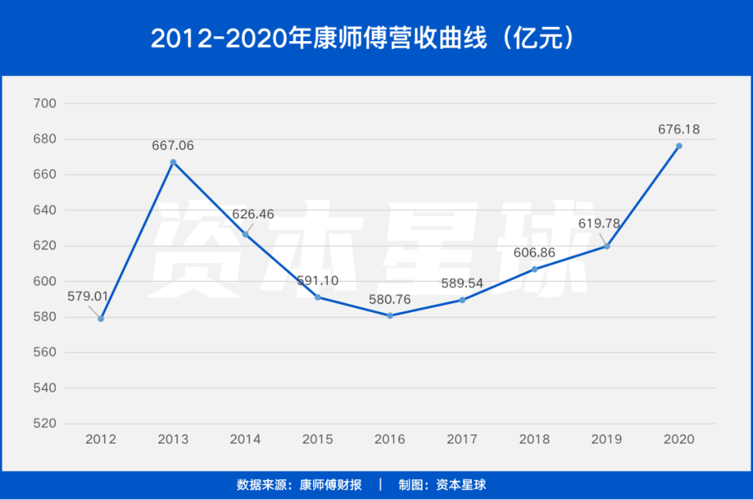 今年3月底,2020财年年报发布,康师傅终于以676.18亿港元营收“返家乡”,同比上升9.10%。看似成绩不错,但股价不会说谎——第二天,其股价跌超6%。