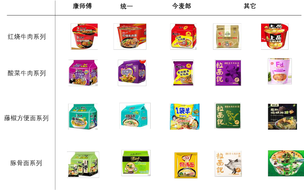 2018年,今麦郎传出上市消息,直指统一和康师傅的地盘。从图中我们不难看出,今麦郎和康师傅各自的经典产品品类几乎平行,甚至包装配色也是一个色系。产品无差异化,今麦郎便在与康师傅价格相当的情况下加大了净重,直指中低端市场。