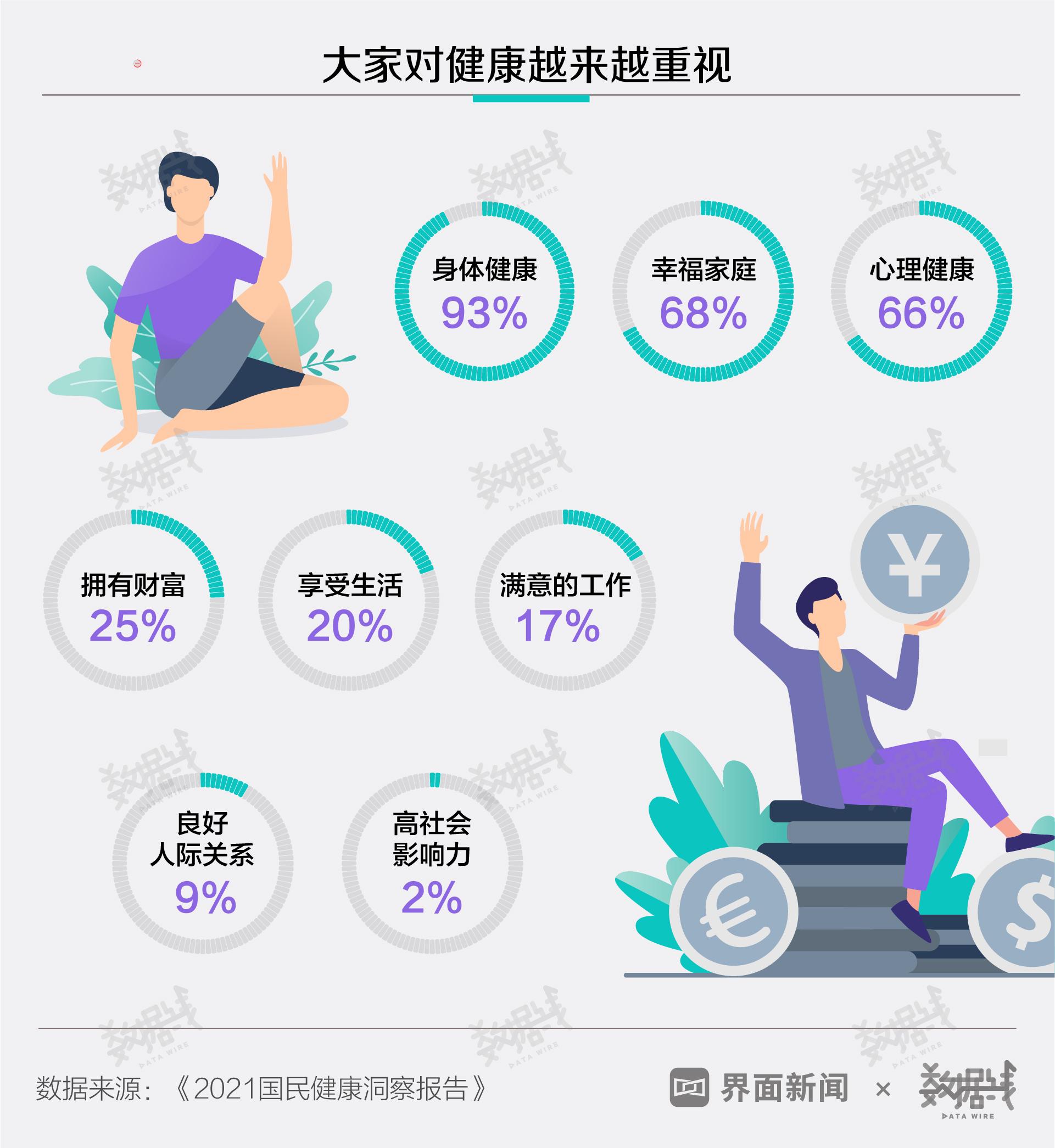 另一方面,人们的健康意识越来越强。据《2021国民健康洞察报告》,有93%的人认为人生中最重要的是“身体健康”,这一比例远高于“幸福家庭”、“拥有财富”等选项。