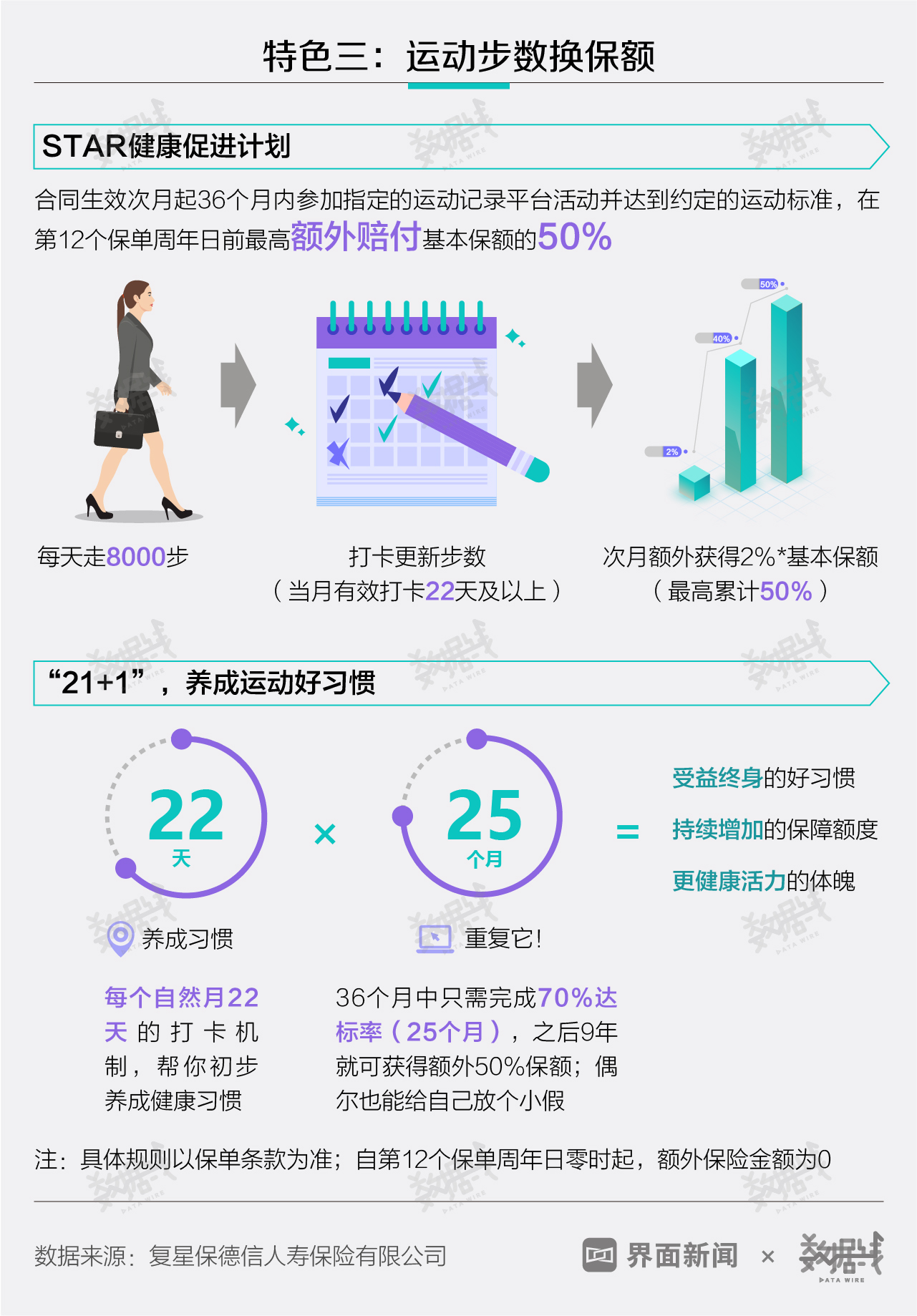 “STAR健康促进计划”是星无忧(星动版)重大疾病保险的最大“卖点”。采取步行打卡换保额的方式,让客户同时享有健康保障和健康管理服务,养成终身受益的好习惯,实现健康、保额“双丰收”。此外,复星保德信还将为满足条件的客户提供臻星守护vip服务,通过名医直通车、医护上门、重疾绿色通道、海外医疗等服务打造一站式就医体验。