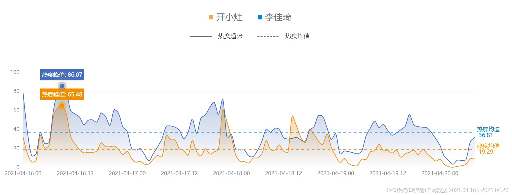 微热点近5日数据显示,“开小灶”与“李佳琦”的热度均在“零食节”直播的前一天,4月16日达到顶点。