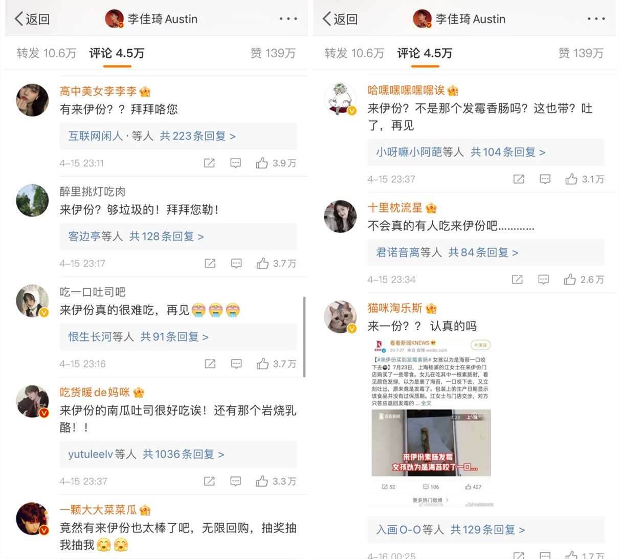 肖战粉丝一方面“引爆”开小灶官微,怪开小灶“不争气”、“给代言人招黑”,一方面在李佳琦微博评论区刷屏,指责来伊份等产品有质量问题。此举引发李佳琦粉丝反感,并纷纷开始晒单来伊份,表示“佳琦选品质量有目共睹,请粉黑大战远离佳琦”。