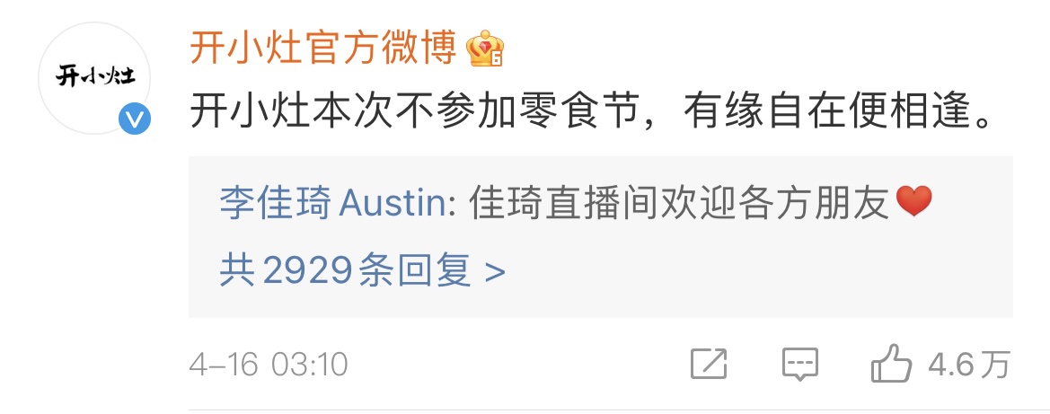 4月14日,开小灶已经在李佳琦公众号发布的直播预告中消失。4月15日晚,李佳琦微博发布“零食节”最终预告,空刻意面、来伊份、三顿半等产品仍然保留,但唯独不见开小灶,让肖战粉丝最终爆发。