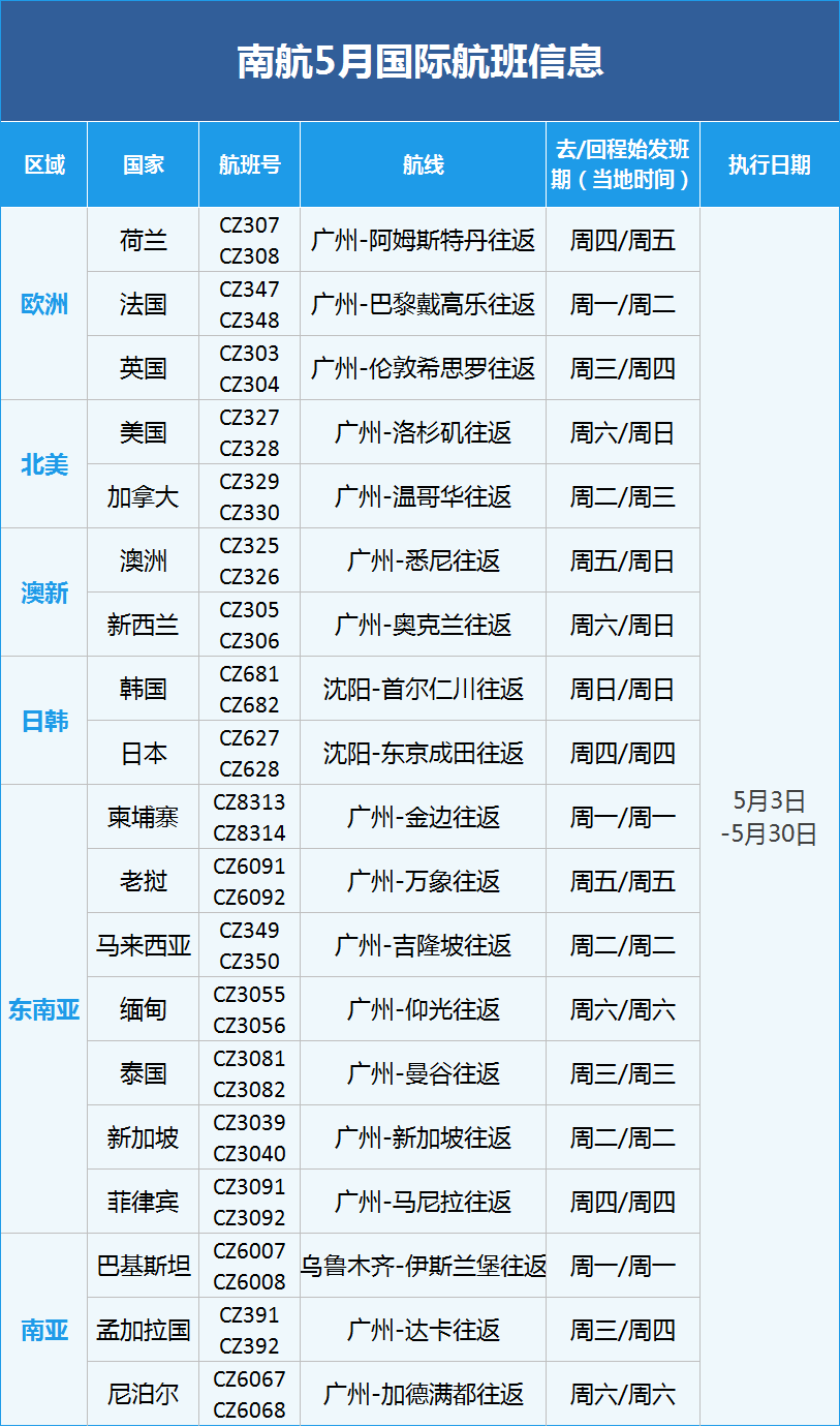 4月21日,南方航空公布了5月国际航班计划。南方航空在其官网微信公众号上指出,自5月3日0时至5月30日24时,南航每周可执行国际航线共计19条,其中涉及广州航线16条,沈阳航线2条,乌鲁木齐航线1条。