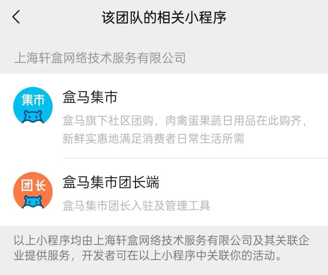 据“盒马集市”开发信息显示,上线于2020年10月上线的“盒马优选”微信小程序在2020年12月1日更名并认证为“盒马集市”,目前盒马入驻微信小程序的主要包括面向消费者的“盒马集市”和面向团长端的“盒马集市团长端”两款小程序——