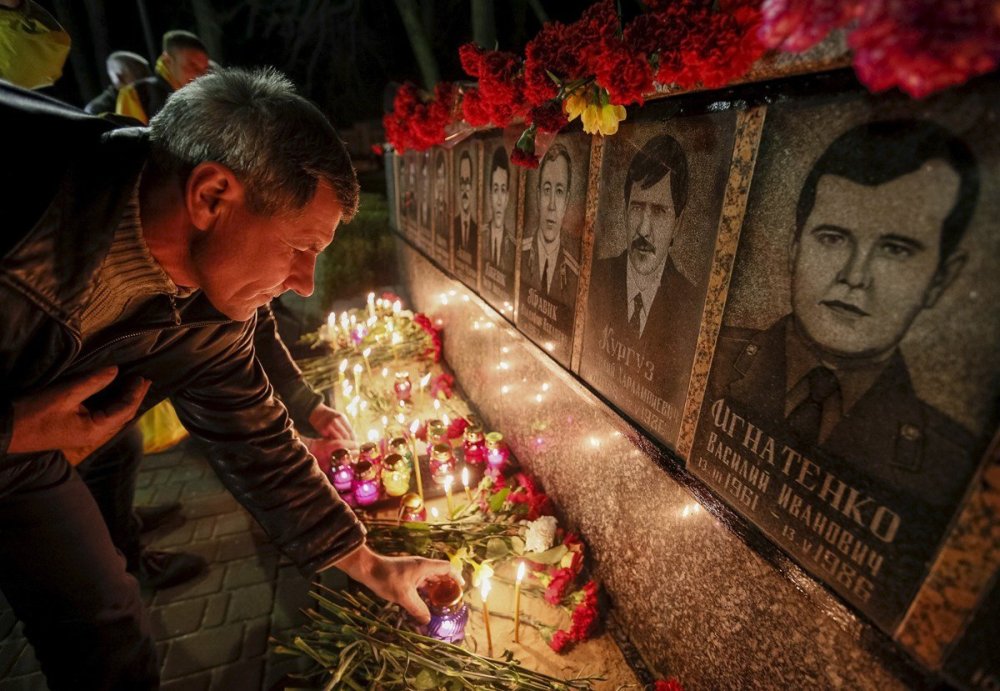 人们祭奠在切尔诺贝利核事故中去世的消防员和工作人员。